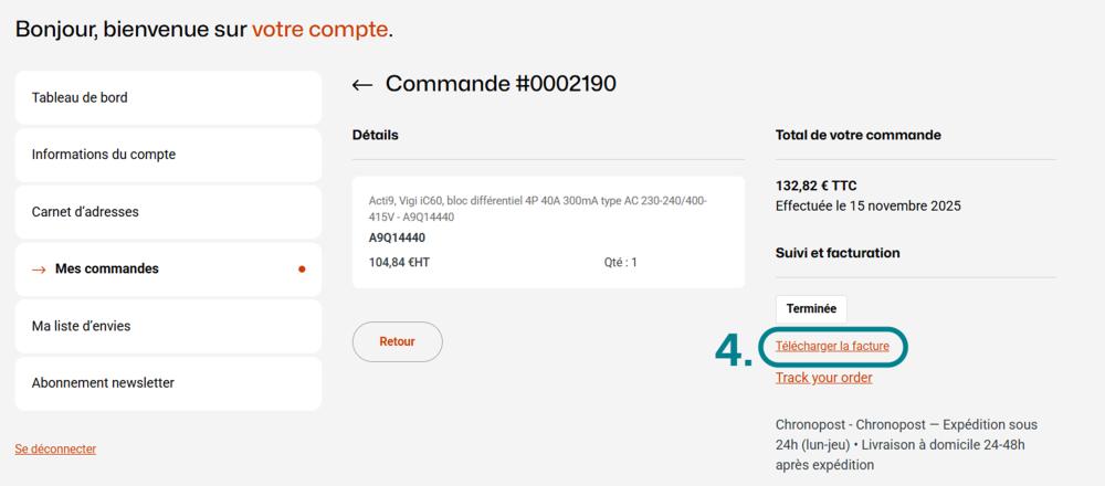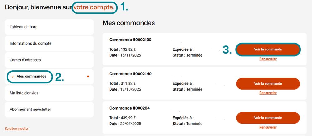 Pour les télécharger, il suffit de suivre le parcours suivant : Mon compte → Mes commandes → Voir la commande → Télécharger la facture (PDF).
