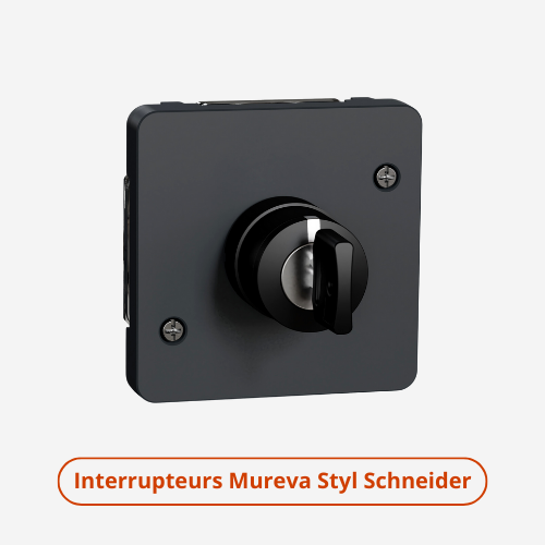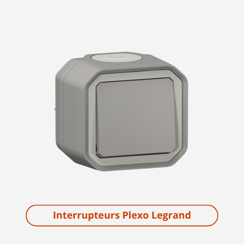 - Interrupteurs étanches : Idéaux pour les environnements extérieurs ou humides, notre sélection comprend les modèles Mureva Styl de Schneider, ainsi que les interrupteurs Plexo de Legrand. Ces derniers sont conçus pour résister à l'eau et à la poussière, garantissant une durabilité optimale. Vous trouverez dans ces collections les prises associées.