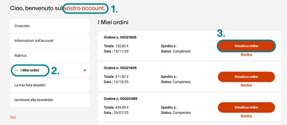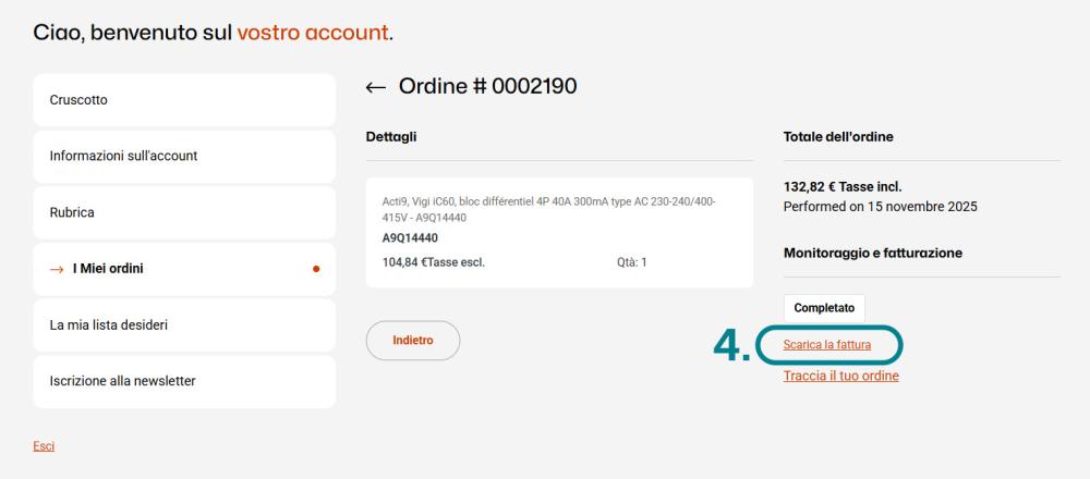 Il mio account → I miei ordini → Visualizza ordine → Scarica la fattura (PDF).