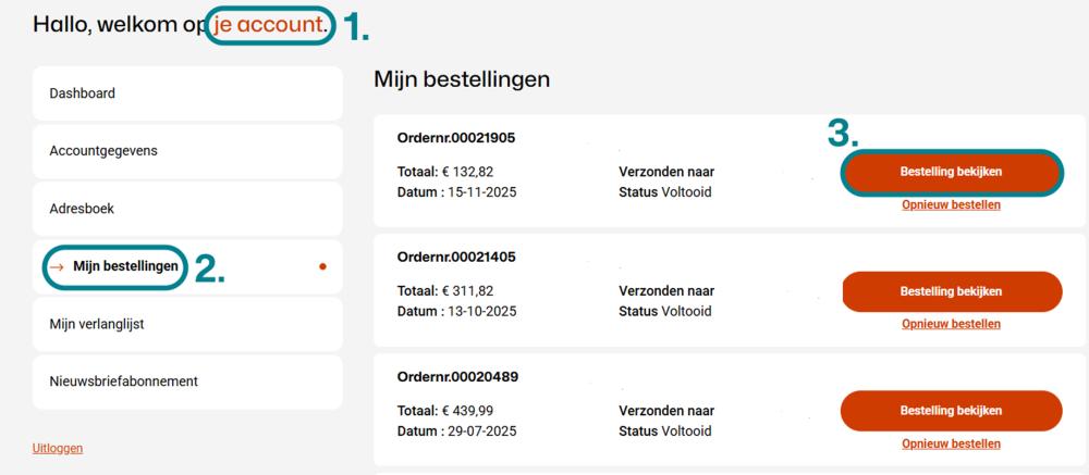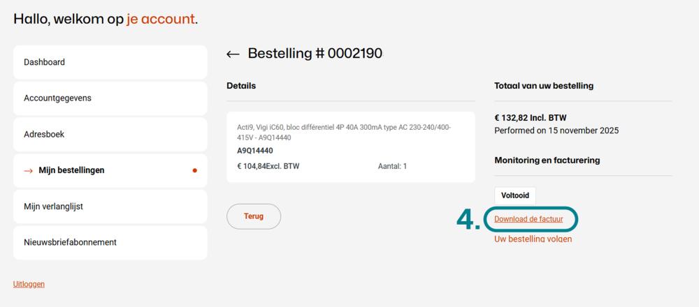 U kunt al uw facturen ook raadplegen in uw klantenzone via deze stappen: Mijn account → Mijn bestellingen → Bestelling bekijken → Factuur downloaden (PDF).