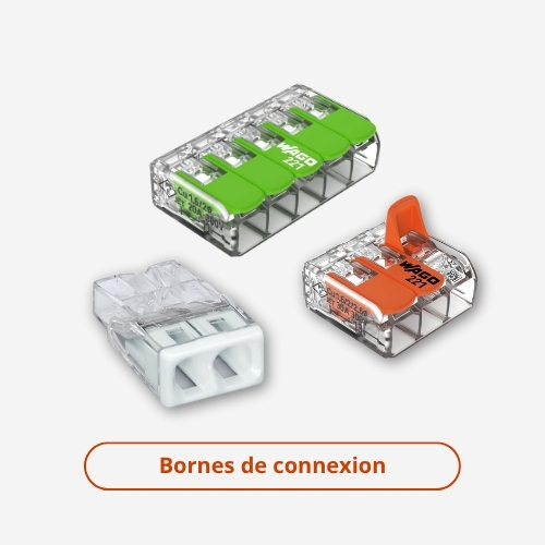 - Bornes à levier orange ou vert : compatibles avec tous types de conducteurs (rigides et souples)